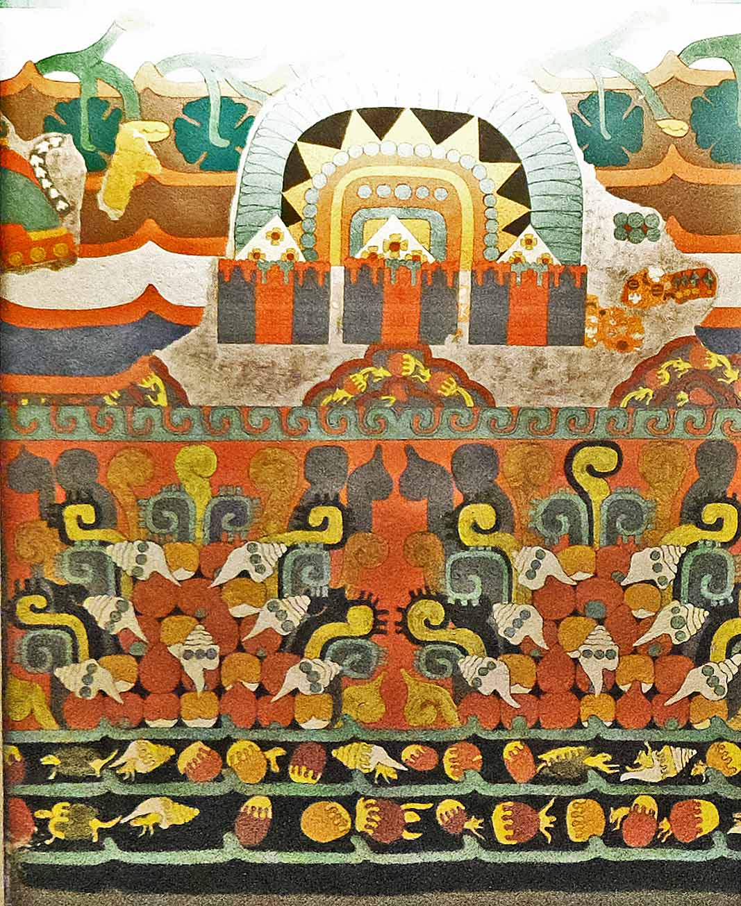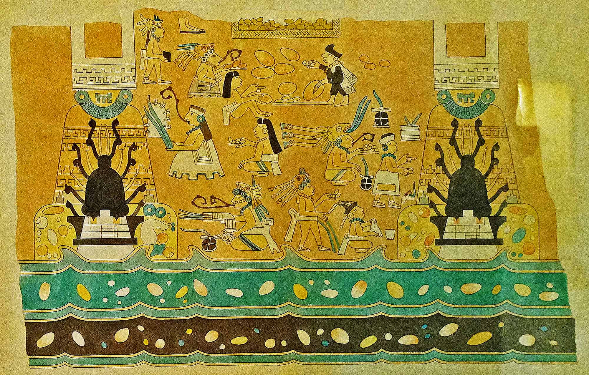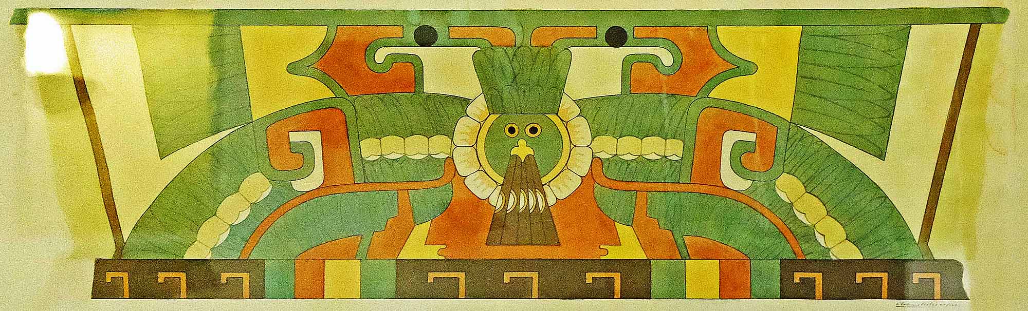 Below is a modern reconstruction of a mural discovered by Padres on the west side of the Temple of Agriculture in 1884. Below that was discovered on the south side in 1886. I have not been able to find the original.
