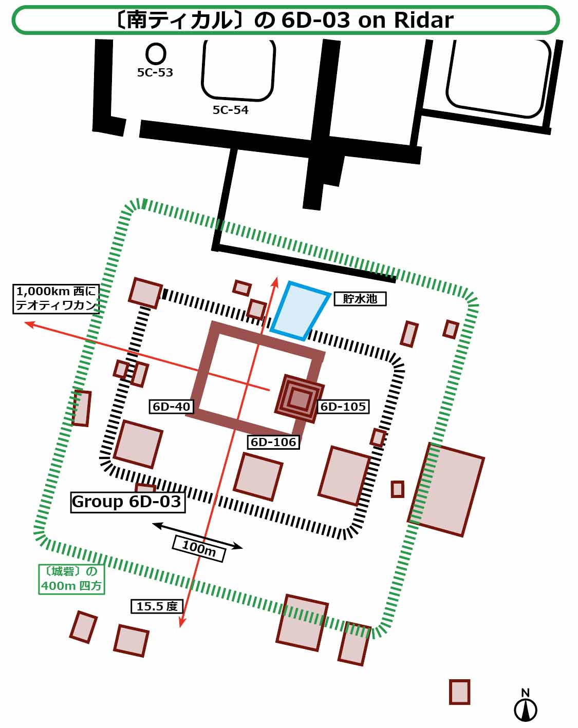 The other Groups have either a 0 degree north-south architectural axis or some deviation, possibly due to topography. Interestingly, Group 6D-03 has an architectural axis of exactly 15.5 degree, and by coincidence its western facade points to the location of Teotihuacan, 1,000 km west.