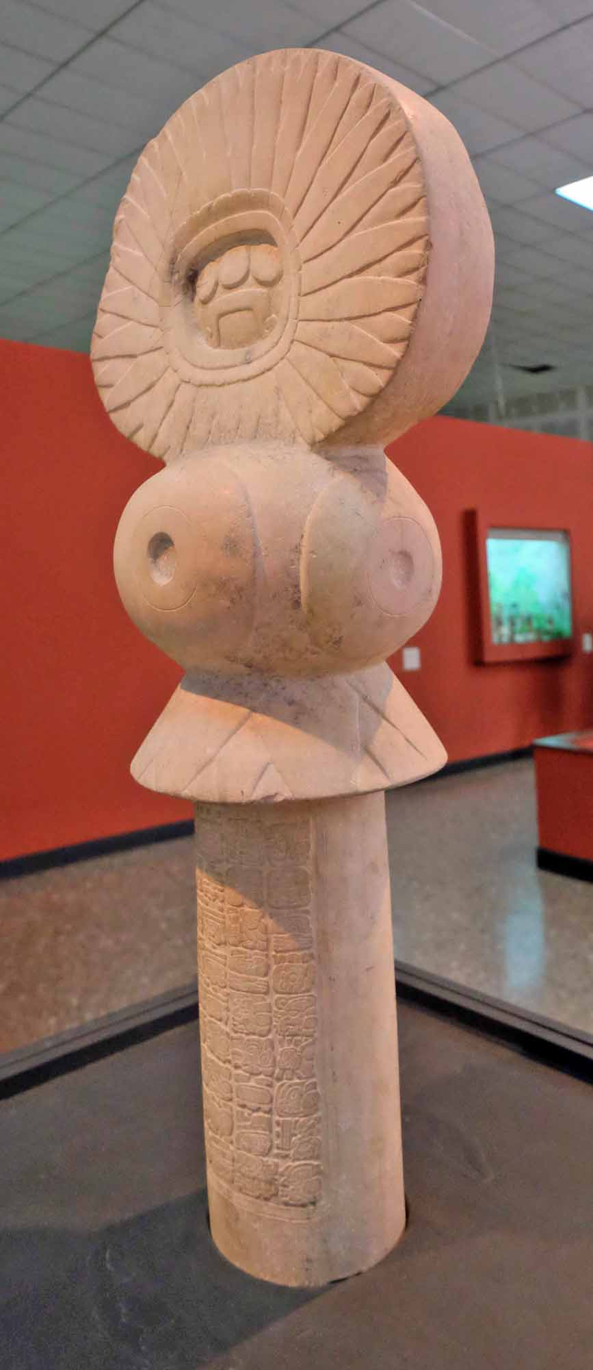It is rare to find a stone monument at Tikal that is almost completely undamaged or undissolved. This is probably because it was only exposed to the elements for 11 years. There is an engraving on the surface, under the feathers, as shown in the third photo above. Based on the content of the pictograms, one of them is ”Shiyaj K'ahk'", or "Spearthrower Owl." Marcador is a sculpture depicting these two by a leader of 6C-16.