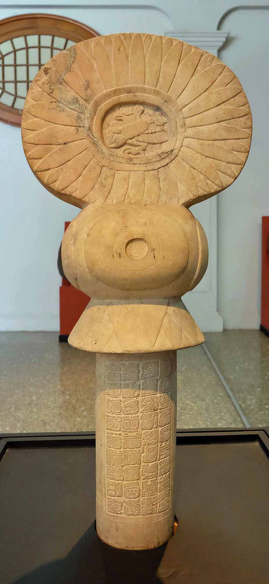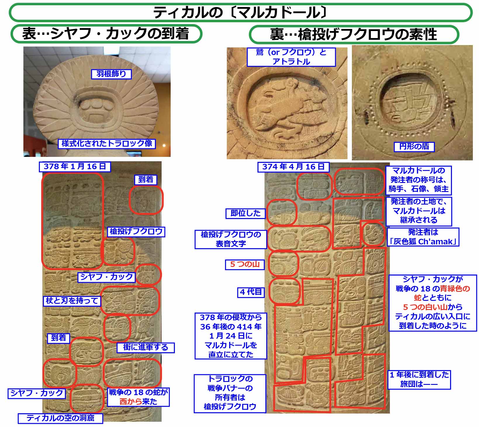 Reverse...On April 16, 374 AD, "Spearthrower Owl," who was crowned as the fourth king at the "Five Mountains," arrived carrying the shield of Tlaloc and accompanied by 18 warriors from Siyahu Ka'ak. This Tikal marker was erected by Gray Fox on January 24, 414.