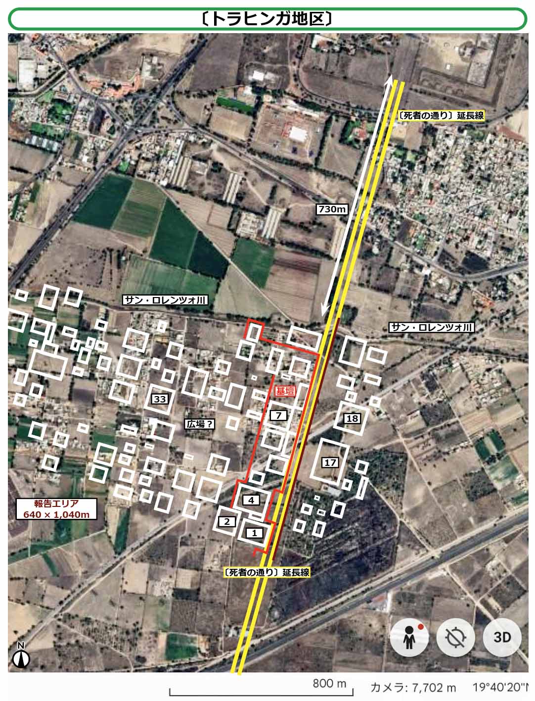 The white squares are buildings. Over 100 have been found in the Tlajinga area, and they follow a 15.5-degree building axis. There are likely a few more beyond the reported area. For convenience, I've drawn them out as neat white squares, but in reality, they are different from the neighborhood apartment complexes we've seen so far.